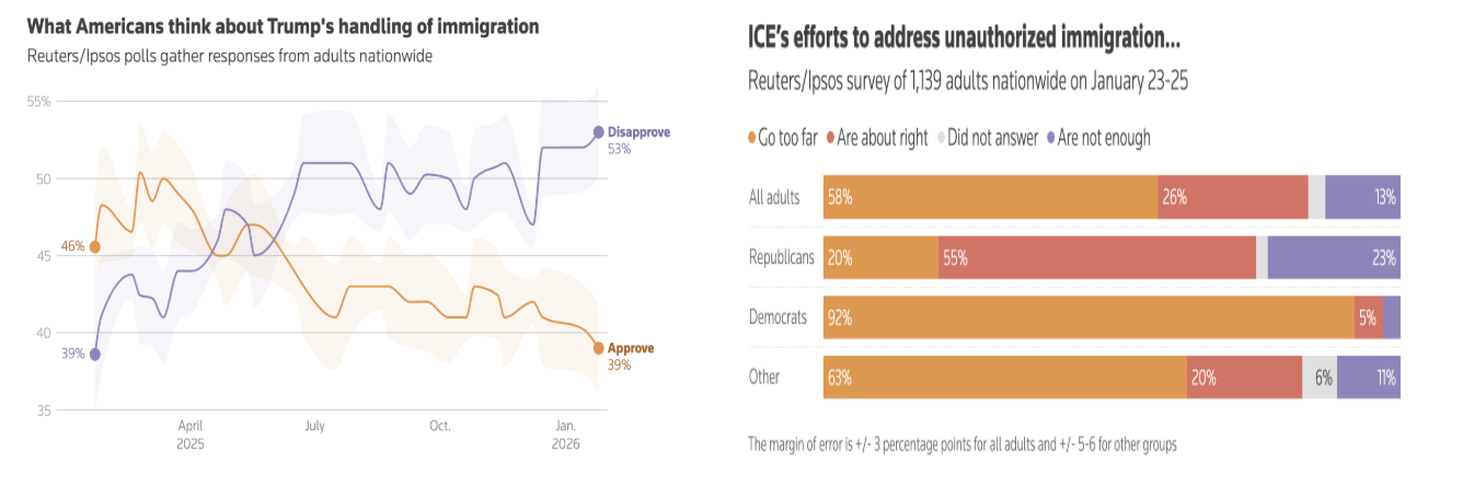 The immigration issue helped return President Donald Trump to the White House in 2024. Trump offered solutions, but the Biden Administration and Democrats didn’t. Now, the Minnesota incidents and the Trump Administration’s messaging have put this issue back in the headlines daily. Trump’s approval numbers have taken a hit as a result, according to the latest Reuters/Ipsos poll.