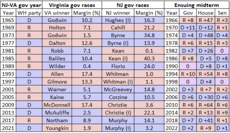 The 1969, 1981, 2001, and 2021 elections didn’t line up as neatly for the Midterms that followed, though there were exceptions. The Democrat wins in Virginia in 1981 lead to a decent Democratic performance in 1982, and Republican wins in Virginia in 2021 previewed the GOP flipping the House in 2022.