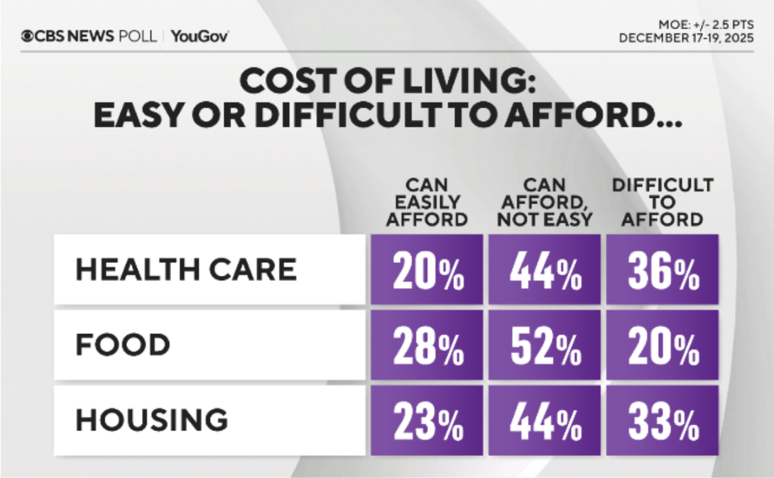 As 2025 comes to a close, CBS News/YouGov poll found health care costs are rising as a top concern for Americans, above food and housing. Overall, most Americans believe the United States is an expensive place to live, but drilling in on what specific expenses cause voters stress is essential for next year’s Midterm Elections. This insight reveals which issues could play a bigger role in victory or defeat.