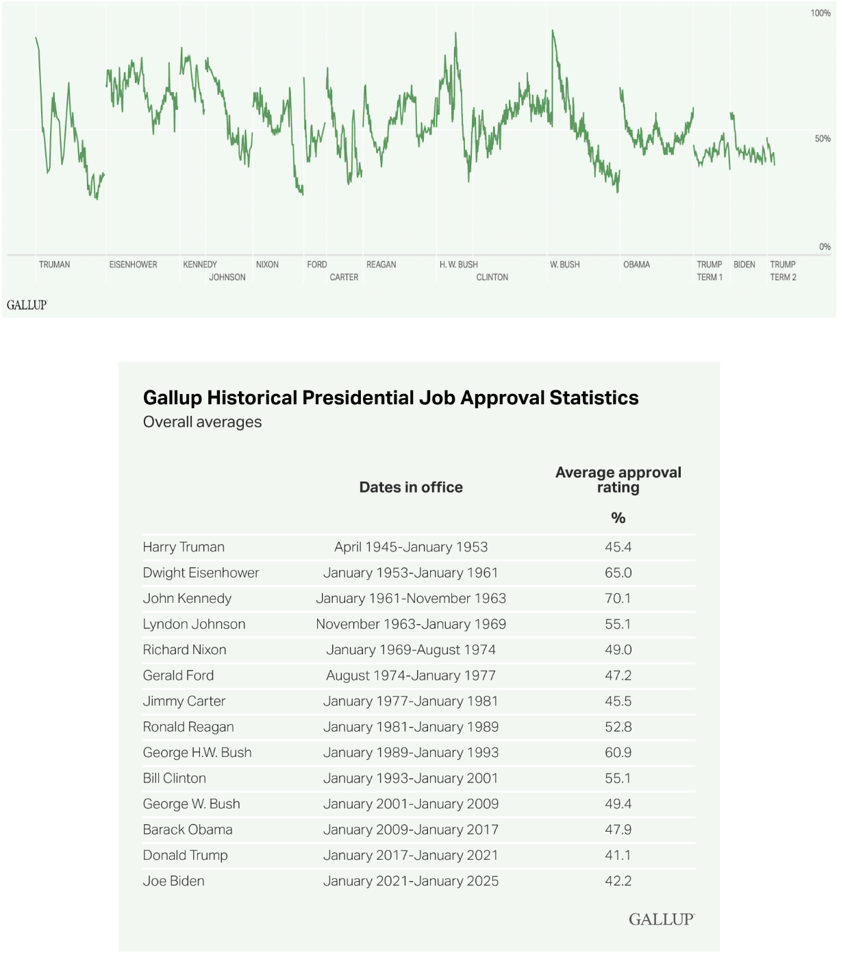 Presidents Harry Truman and Joe Biden received some of the lowest average approval ratings over the course of their terms, 45% and 42%, respectively.