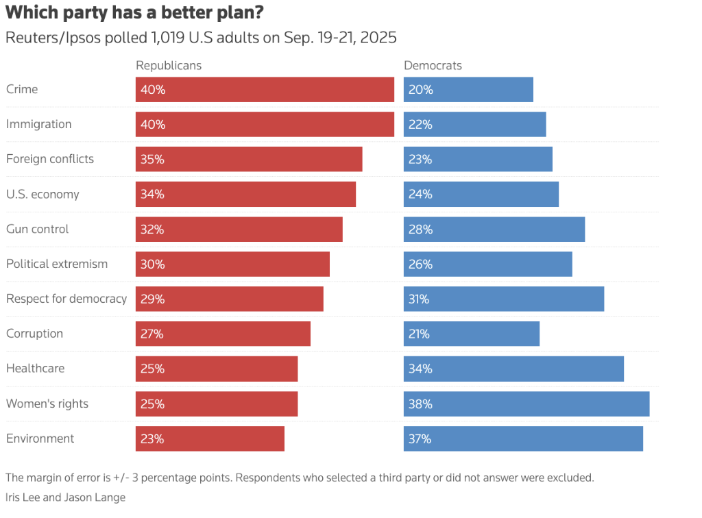 A new Reuters/Ispos poll found President Donald Trump’s approval rating declined again this month and is now 41%. More interestingly, however, was the responses on which party has the better for specific issues.
